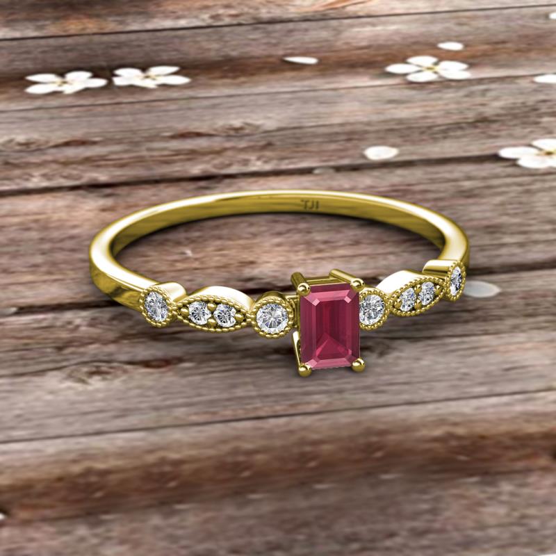 Emerald Cut (6x4 mm) Rhodolite Garnet and Round Diamond 3/4 ctw Marquise and Dot Womens Engagement Ring 10K Yellow Gold More Details ...