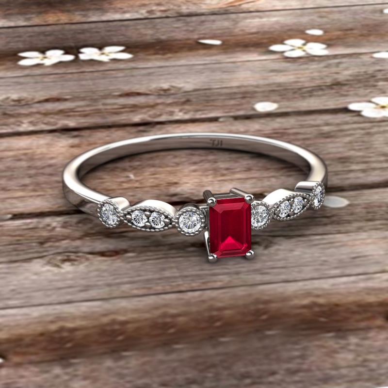 This Contemporary Engagement Ring Embodies Emerald Cut Ruby with Marquise and Dot Diamond accents on the shank that showcases luxury and is sure to Impress.