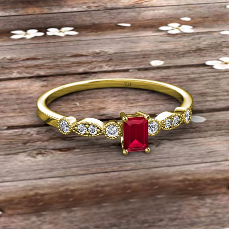 Emerald Cut (6x4 mm) Ruby and Round Lab Grown Diamond 1/2 ctw Marquise and Dot Womens Engagement Ring 14K Yellow Gold More Details ...