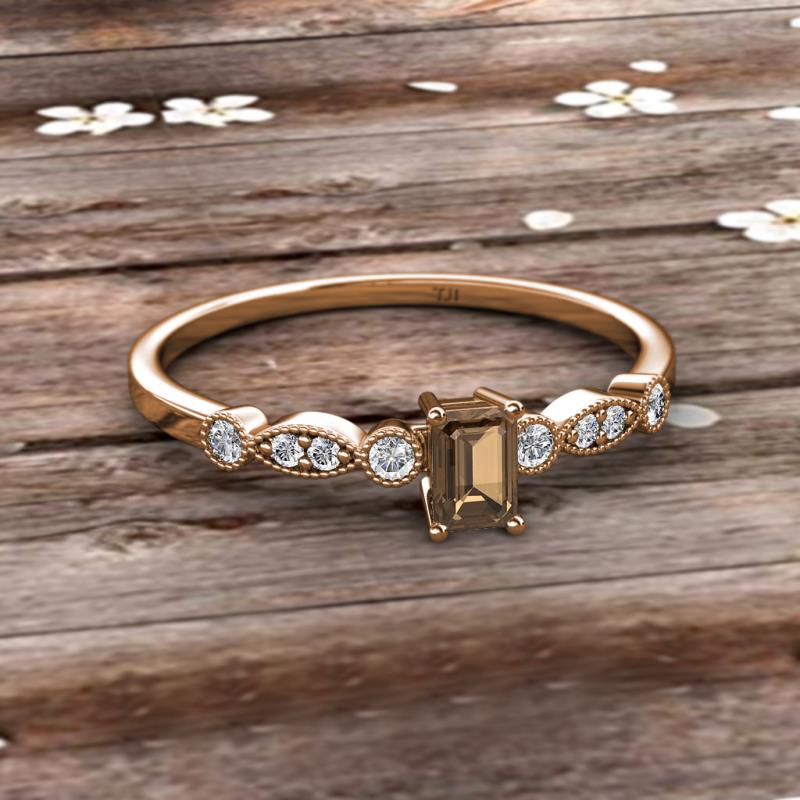 This Contemporary Engagement Ring Embodies Emerald Cut Smoky Quartz with Marquise and Dot Diamond accents on the shank that showcases luxury and is sure to Impress.
