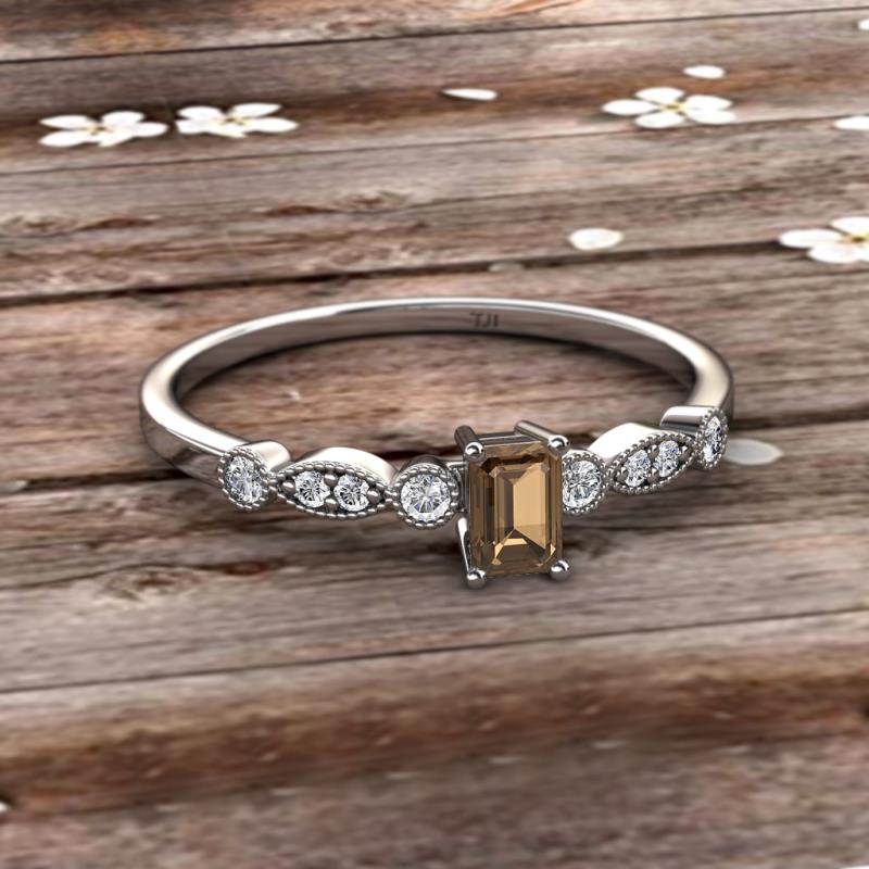 This Contemporary Engagement Ring Embodies Emerald Cut Smoky Quartz with Marquise and Dot Diamond accents on the shank that showcases luxury and is sure to Impress.