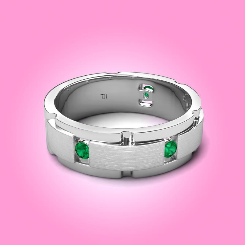 Wish To Look Stunning On Your Big Day, this Wedding Band of 0.16 ctw Round Emerald Satin Finished Center and Polished Edges with Grooved Lines, will do the magic for you.
