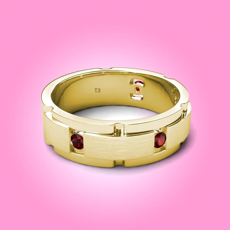 Wish To Look Stunning On Your Big Day, this Wedding Band of 0.27 ctw Round Red Garnet Satin Finished Center and Polished Edges with Grooved Lines, will do the magic for you.