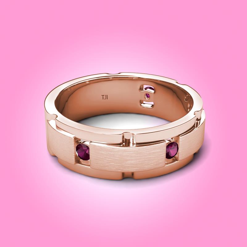 Round Rhodolite Garnet 0.27 ctw Satin Finished Center and Polished Edges with Grooved Lines Men Wedding Band 10K Rose Gold More Details ...