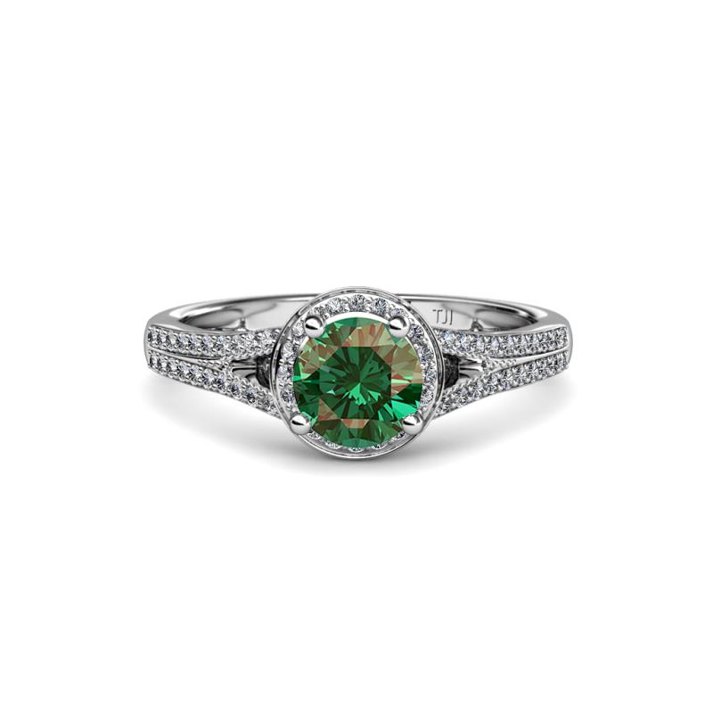 Make a beautiful beginning with this Engagement Ring where Halo of Diamonds hold the Center Lab Created Alexandrite while the Ring's shank has Milgrain detailing in the open split continuing with row of Diamonds and side undergallery work with single Bezel set Diamond which alltogether makes it look vintage and royal.