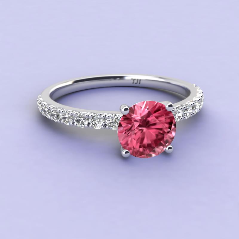 You can never go wrong with the enduring sophistication of a round-shaped stone. This refined Engagement Ring has center Round Pink Tourmaline, set on a Diamond accented band.