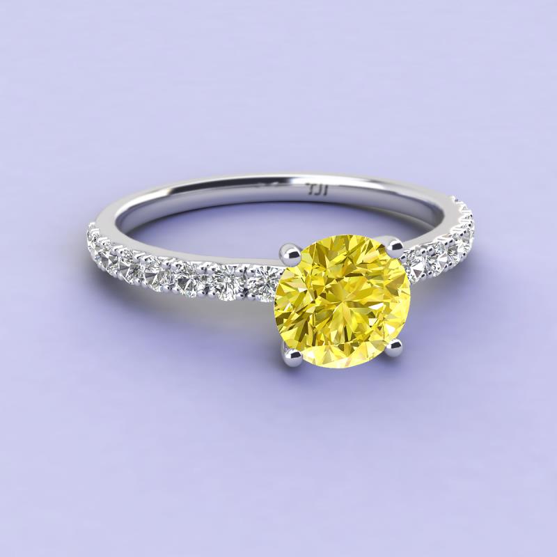 You can never go wrong with the enduring sophistication of a round-shaped stone. This refined Engagement Ring has center Round Yellow Diamond, set on a Diamond accented band.
