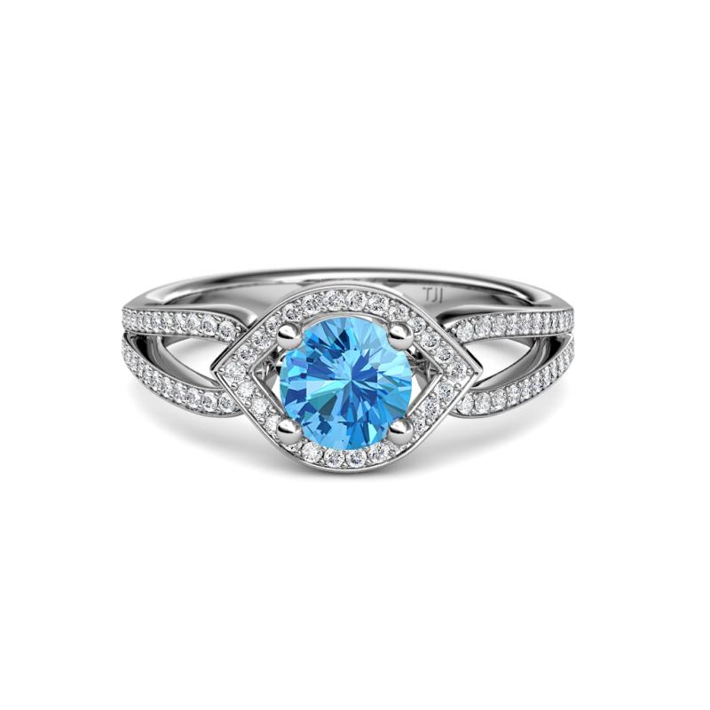 Get one of a kind engagement ring for a proposal to remember, with Center Blue Topaz embraced by eye shaped halo of Diamonds with single row open split pave shank which makes it a mix of vintage elegance and modern design