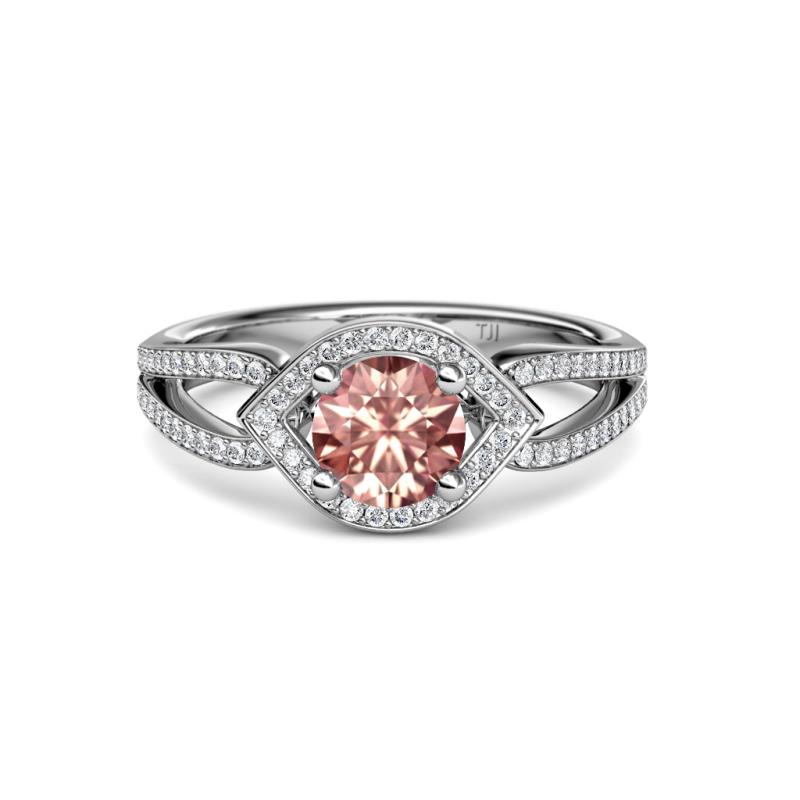 Get one of a kind engagement ring for a proposal to remember, with Center Morganite embraced by eye shaped halo of Diamonds with single row open split pave shank which makes it a mix of vintage elegance and modern design