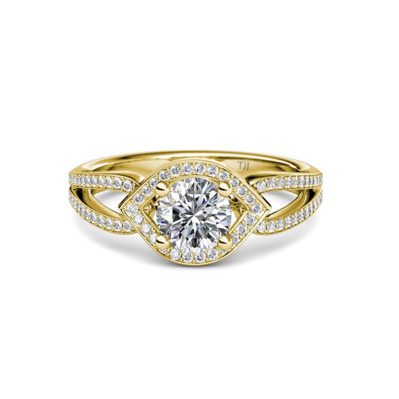 Get one of a kind engagement ring for a proposal to remember, with Center Diamond embraced by eye shaped halo of Diamonds with single row open split pave shank which makes it a mix of vintage elegance and modern design