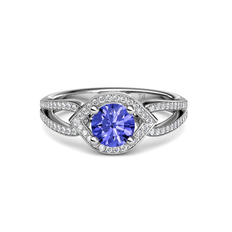 Get one of a kind engagement ring for a proposal to remember, with Center Tanzanite embraced by eye shaped halo of Diamonds with single row open split pave shank which makes it a mix of vintage elegance and modern design