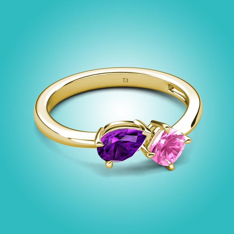 The Amethyst Pear Shape and Lab Created Pink Sapphire Cushion Shape Two Stone Engagement Ring of 1.46 ctw set in a Prong setting, is a stunning piece of jewelry that features a unique Toi et Moi design, which means You and Me in French, symbolizing the union of two souls in love and giving a comfort fit to the wearer.