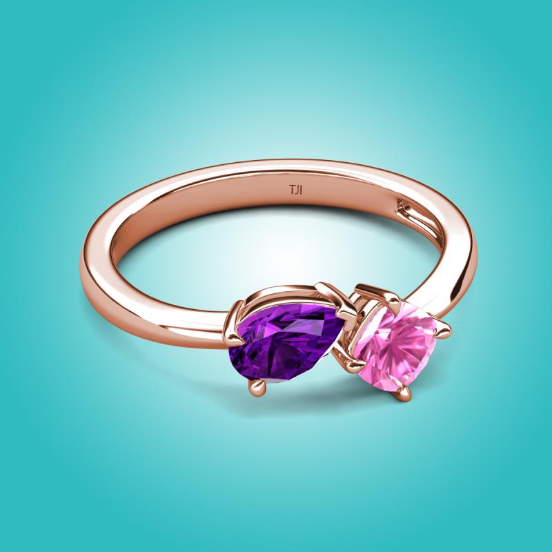 The Amethyst Pear Shape and Lab Created Pink Sapphire Cushion Shape Two Stone Engagement Ring of 1.46 ctw set in a Prong setting, is a stunning piece of jewelry that features a unique "Toi et Moi" design, which means "You and Me" in French, symbolizing the union of two souls in love and giving a comfort fit to the wearer.