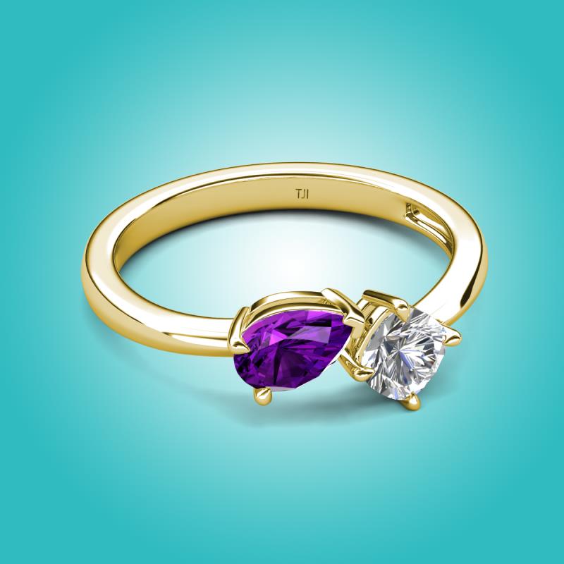 The Amethyst Pear Shape and Lab Grown Diamond Cushion Shape Two Stone Engagement Ring of 1.15 ctw set in a Prong setting, is a stunning piece of jewelry that features a unique "Toi et Moi" design, which means "You and Me" in French, symbolizing the union of two souls in love and giving a comfort fit to the wearer.