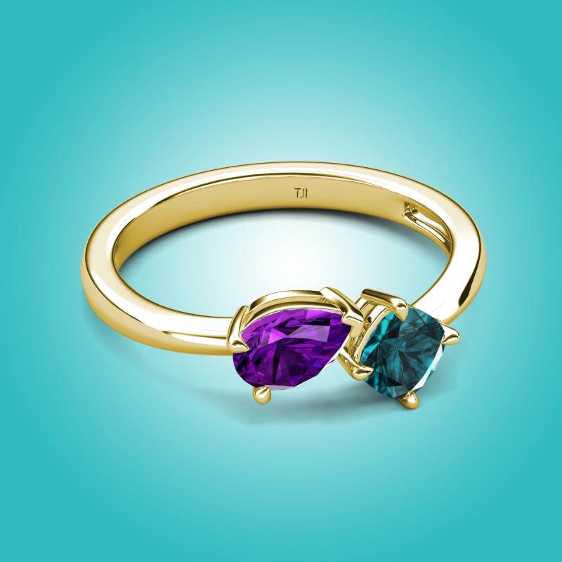 The Amethyst Pear Shape and London Blue Topaz Cushion Shape Two Stone Engagement Ring of 1.40 ctw set in a Prong setting, is a stunning piece of jewelry that features a unique "Toi et Moi" design, which means "You and Me" in French, symbolizing the union of two souls in love and giving a comfort fit to the wearer.