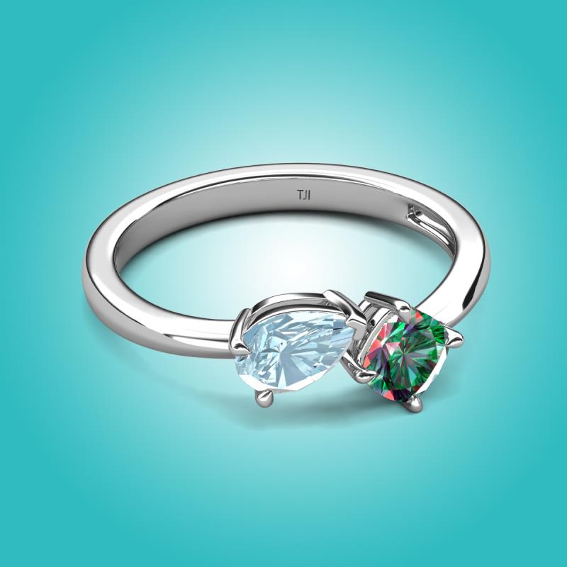 The Aquamarine Pear Shape and Lab Created Alexandrite Cushion Shape Two Stone Engagement Ring of 1.41 ctw set in a Prong setting, is a stunning piece of jewelry that features a unique Toi et Moi design, which means You and Me in French, symbolizing the union of two souls in love and giving a comfort fit to the wearer.