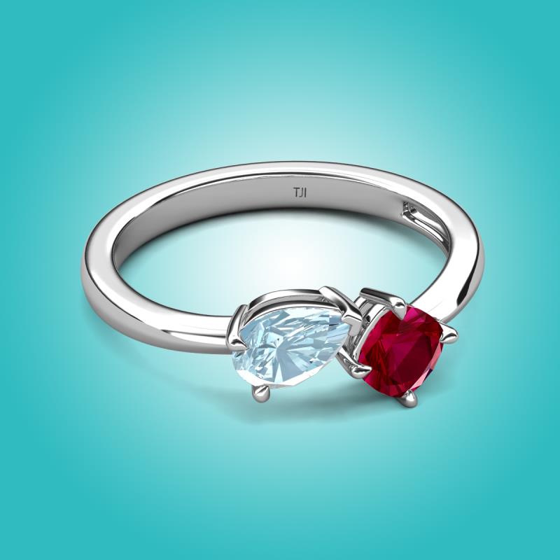 The Aquamarine Pear Shape and Lab Created Ruby Cushion Shape Two Stone Engagement Ring of 1.41 ctw set in a Prong setting, is a stunning piece of jewelry that features a unique Toi et Moi design, which means You and Me in French, symbolizing the union of two souls in love and giving a comfort fit to the wearer.