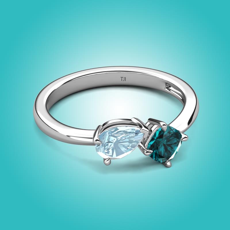 The Aquamarine Pear Shape and London Blue Topaz Cushion Shape Two Stone Engagement Ring of 1.35 ctw set in a Prong setting, is a stunning piece of jewelry that features a unique "Toi et Moi" design, which means "You and Me" in French, symbolizing the union of two souls in love and giving a comfort fit to the wearer.