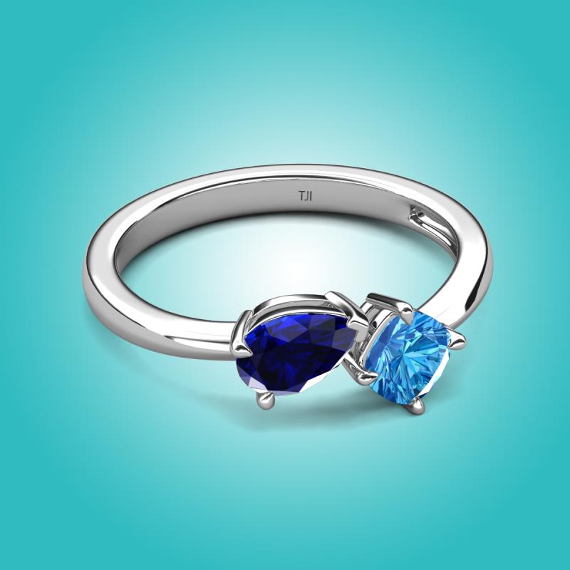 The Blue Sapphire Pear Shape and Blue Topaz Cushion Shape Two Stone Engagement Ring of 1.65 ctw set in a Prong setting, is a stunning piece of jewelry that features a unique "Toi et Moi" design, which means "You and Me" in French, symbolizing the union of two souls in love and giving a comfort fit to the wearer.