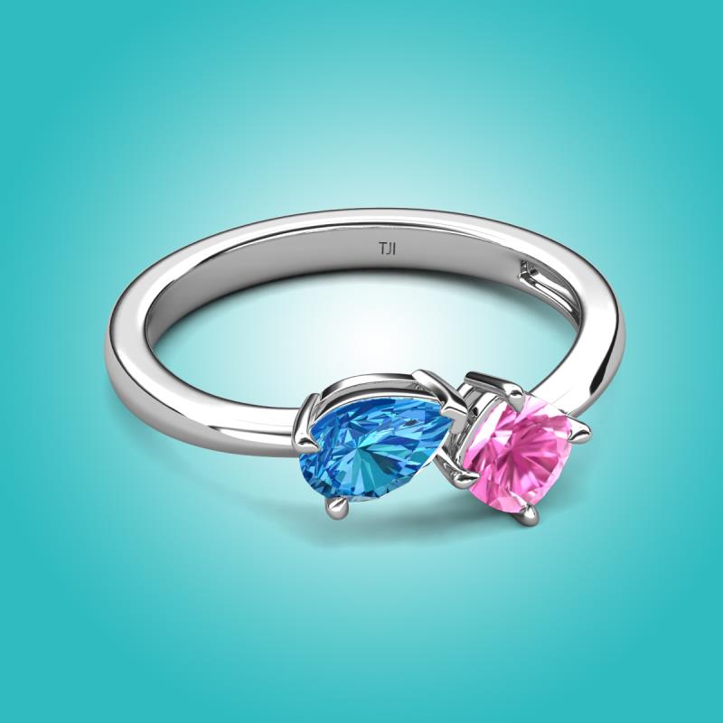 The Blue Topaz Pear Shape and Lab Created Pink Sapphire Cushion Shape Two Stone Engagement Ring of 1.66 ctw set in a Prong setting, is a stunning piece of jewelry that features a unique Toi et Moi design, which means You and Me in French, symbolizing the union of two souls in love and giving a comfort fit to the wearer.