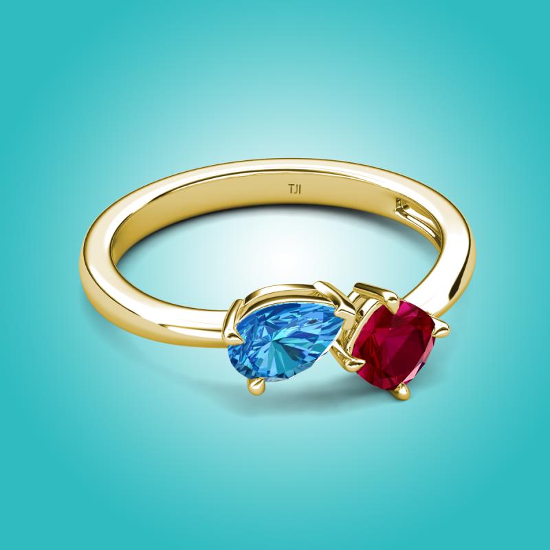 1.66 ctw Blue Topaz Pear Shape 7x5 mm & Lab Created Ruby Cushion Shape 5.00 mm with Prong setting Two Stone Duo Women Engagement Ring in 14K Yellow Gold More Details ...