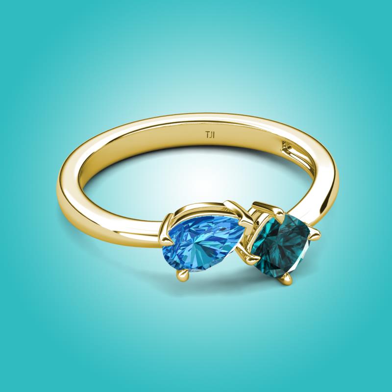 1.60 ctw Blue Topaz Pear Shape 7x5 mm & London Blue Topaz Cushion Shape 5.00 mm with Prong setting Two Stone Duo Women Engagement Ring in 18K Yellow Gold More Details ...