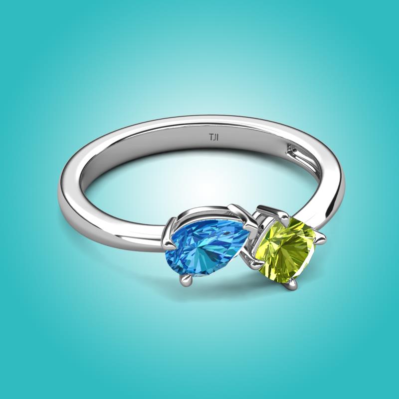 The Blue Topaz Pear Shape and Peridot Cushion Shape Two Stone Engagement Ring of 1.50 ctw set in a Prong setting, is a stunning piece of jewelry that features a unique "Toi et Moi" design, which means "You and Me" in French, symbolizing the union of two souls in love and giving a comfort fit to the wearer.