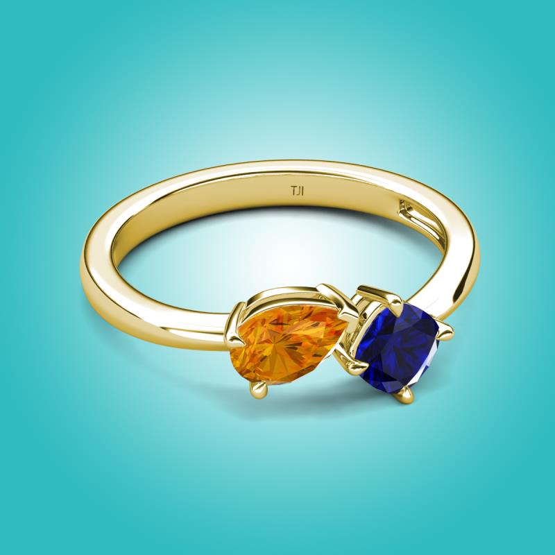 1.46 ctw Citrine Pear Shape 7x5 mm & Lab Created Blue Sapphire Cushion Shape 5.00 mm with Prong setting Two Stone Duo Women Engagement Ring in 14K Yellow Gold More Details ...