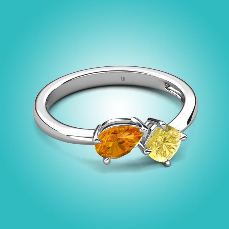 The Citrine Pear Shape and Lab Created Yellow Sapphire Cushion Shape Two Stone Engagement Ring of 1.46 ctw set in a Prong setting, is a stunning piece of jewelry that features a unique "Toi et Moi" design, which means "You and Me" in French, symbolizing the union of two souls in love and giving a comfort fit to the wearer.