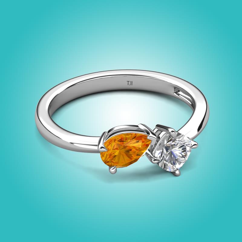 The Citrine Pear Shape and Lab Grown Diamond Cushion Shape Two Stone Engagement Ring of 1.15 ctw set in a Prong setting, is a stunning piece of jewelry that features a unique "Toi et Moi" design, which means "You and Me" in French, symbolizing the union of two souls in love and giving a comfort fit to the wearer.