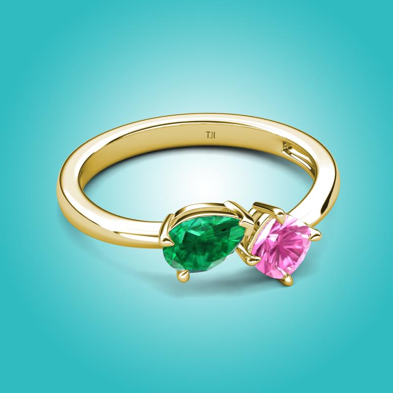1.61 ctw Emerald Pear Shape 7x5 mm & Lab Created Pink Sapphire Cushion Shape 5.00 mm with Prong setting Two Stone Duo Women Engagement Ring in 14K Yellow Gold More Details ...