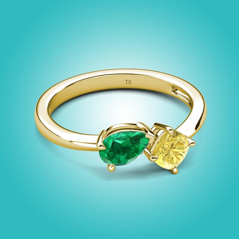 The Emerald Pear Shape and Lab Created Yellow Sapphire Cushion Shape Two Stone Engagement Ring of 1.61 ctw set in a Prong setting, is a stunning piece of jewelry that features a unique "Toi et Moi" design, which means "You and Me" in French, symbolizing the union of two souls in love and giving a comfort fit to the wearer.