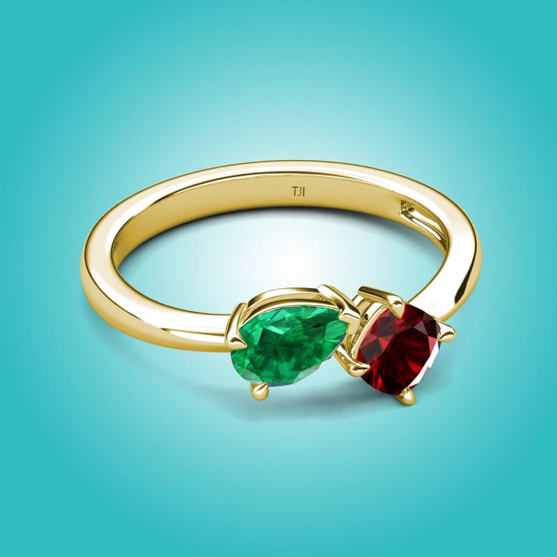The Emerald Pear Shape and Red Garnet Cushion Shape Two Stone Engagement Ring of 1.55 ctw set in a Prong setting, is a stunning piece of jewelry that features a unique "Toi et Moi" design, which means "You and Me" in French, symbolizing the union of two souls in love and giving a comfort fit to the wearer.