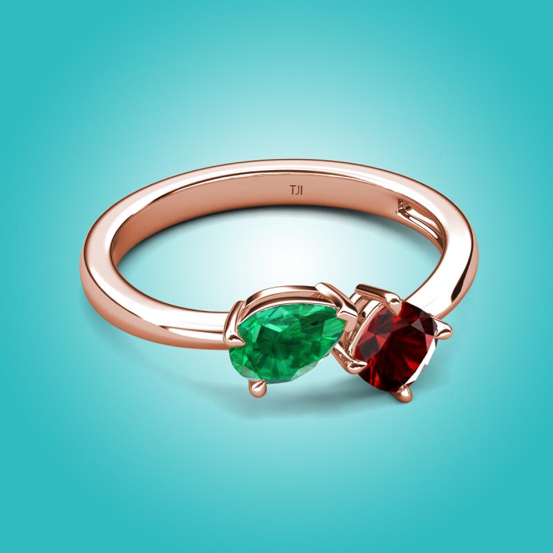 The Emerald Pear Shape and Red Garnet Cushion Shape Two Stone Engagement Ring of 1.55 ctw set in a Prong setting, is a stunning piece of jewelry that features a unique "Toi et Moi" design, which means "You and Me" in French, symbolizing the union of two souls in love and giving a comfort fit to the wearer.