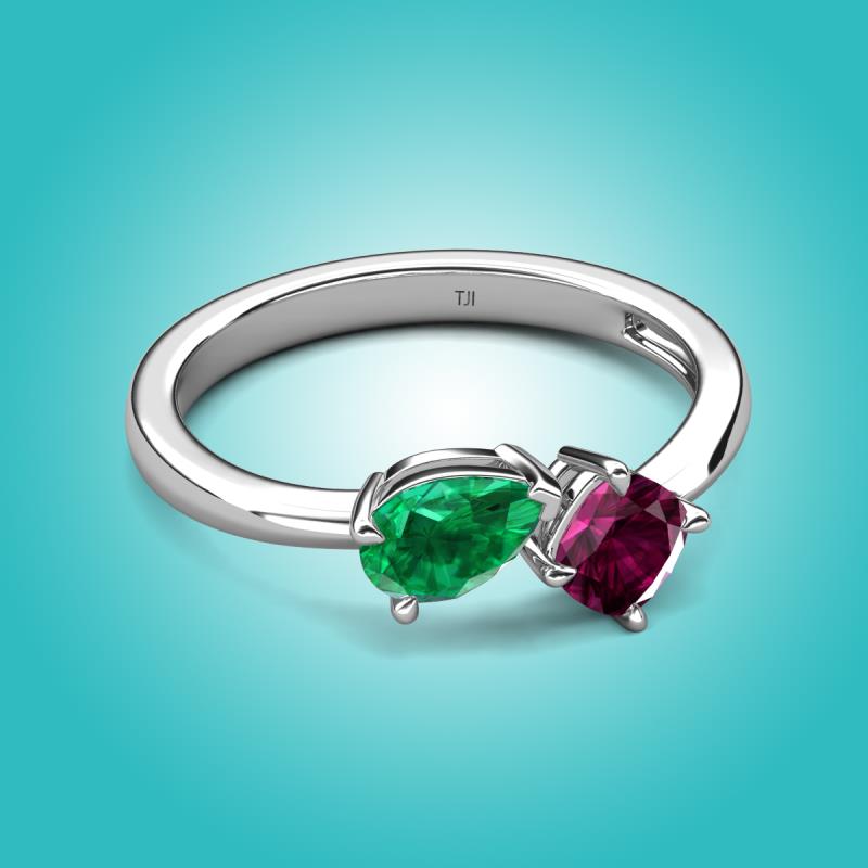 1.42 ctw Emerald Pear Shape 7x5 mm & Rhodolite Garnet Cushion Shape 5.00 mm with Prong setting Two Stone Duo Women Engagement Ring in 14K White Gold More Details ...