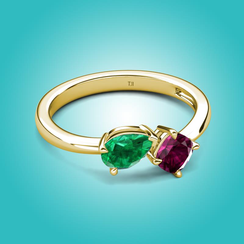 1.42 ctw Emerald Pear Shape 7x5 mm & Rhodolite Garnet Cushion Shape 5.00 mm with Prong setting Two Stone Duo Women Engagement Ring in 18K Yellow Gold More Details ...