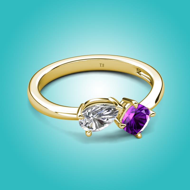 1.30 ctw GIA Certified Natural Diamond Pear Shape 7x5 mm & Amethyst Cushion Shape 5.00 mm with Prong setting Two Stone Duo Women Engagement Ring in 14K Yellow Gold More Details ...
