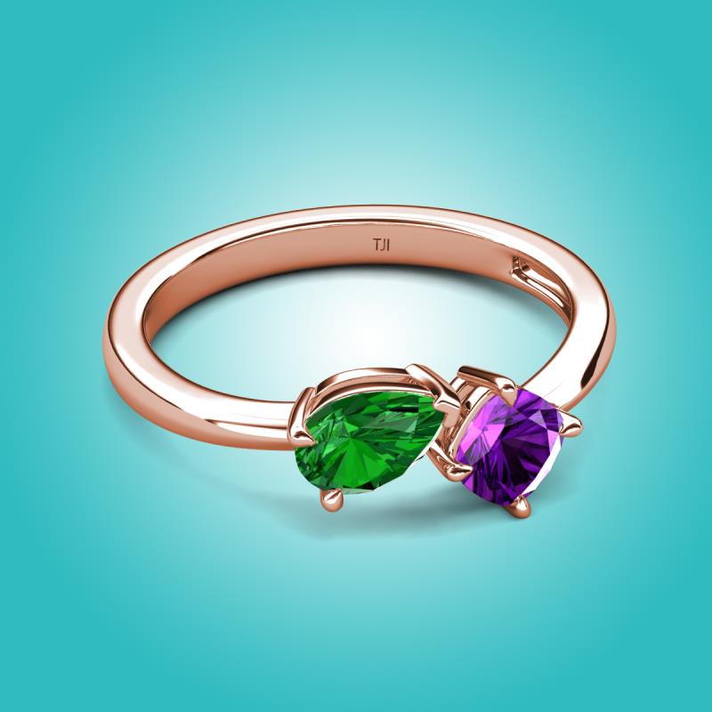 1.30 ctw Green Garnet Pear Shape 7x5 mm & Amethyst Cushion Shape 5.00 mm with Prong setting Two Stone Duo Women Engagement Ring in 14K Rose Gold More Details ...