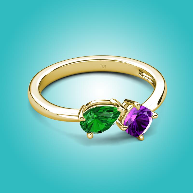 1.30 ctw Green Garnet Pear Shape 7x5 mm & Amethyst Cushion Shape 5.00 mm with Prong setting Two Stone Duo Women Engagement Ring in 14K Yellow Gold More Details ...