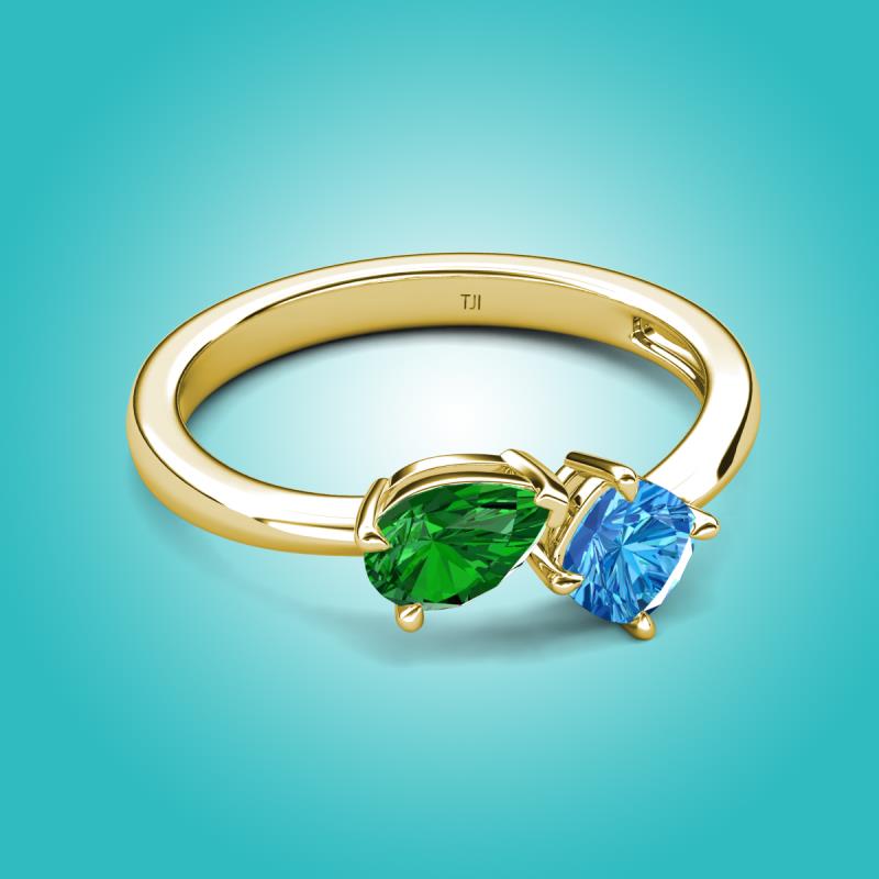 1.55 ctw Green Garnet Pear Shape 7x5 mm & Blue Topaz Cushion Shape 5.00 mm with Prong setting Two Stone Duo Women Engagement Ring in 18K Yellow Gold More Details ...