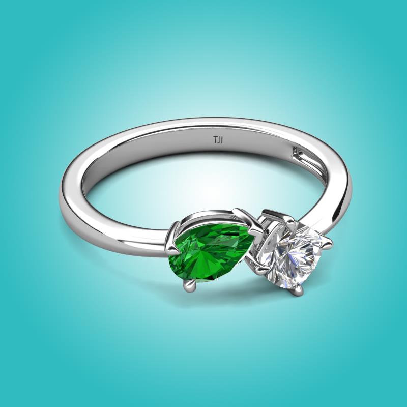 The Green Garnet Pear Shape and Natural Diamond Cushion Shape Two Stone Engagement Ring of 1.30 ctw set in a Prong setting, is a stunning piece of jewelry that features a unique "Toi et Moi" design, which means "You and Me" in French, symbolizing the union of two souls in love and giving a comfort fit to the wearer.