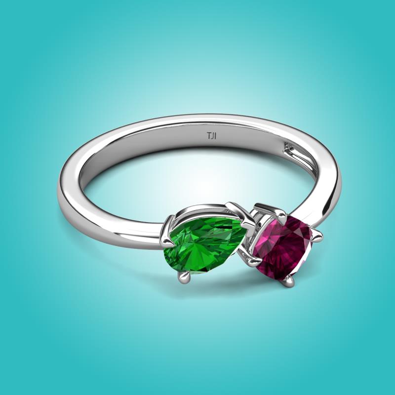 1.42 ctw Green Garnet Pear Shape 7x5 mm & Rhodolite Garnet Cushion Shape 5.00 mm with Prong setting Two Stone Duo Women Engagement Ring in 14K White Gold More Details ...