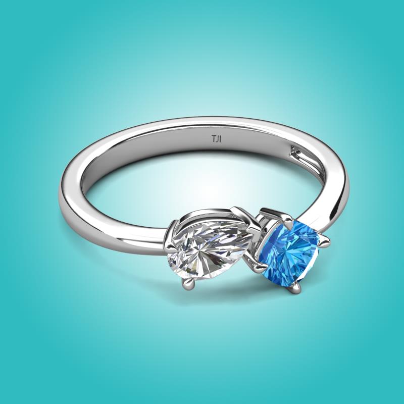 The IGI Certified Lab Grown Diamond Pear Shape and Blue Topaz Cushion Shape Two Stone Engagement Ring of 1.50 ctw set in a Prong setting, is a stunning piece of jewelry that features a unique "Toi et Moi" design, which means "You and Me" in French, symbolizing the union of two souls in love and giving a comfort fit to the wearer.