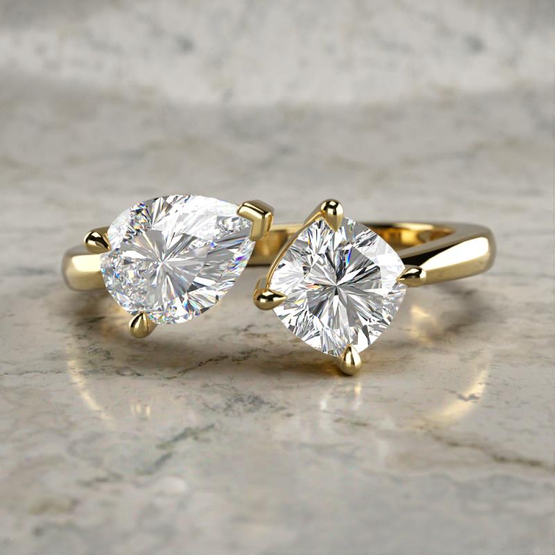 The IGI Certrified Lab Grown Diamond Pear Shape and Lab Grown Diamond Cushion Shape Two Stone Engagement Ring of 1.25 ctw set in a Prong setting, is a stunning piece of jewelry that features a unique "Toi et Moi" design, which means "You and Me" in French, symbolizing the union of two souls in love and giving a comfort fit to the wearer.