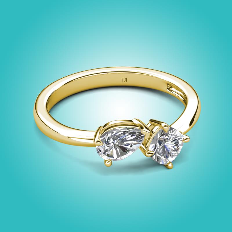 The IGI Certified Lab Grown Diamond Pear Shape and Moissanite Cushion Shape Two Stone Engagement Ring of 1.32 ctw set in a Prong setting, is a stunning piece of jewelry that features a unique "Toi et Moi" design, which means "You and Me" in French, symbolizing the union of two souls in love and giving a comfort fit to the wearer.