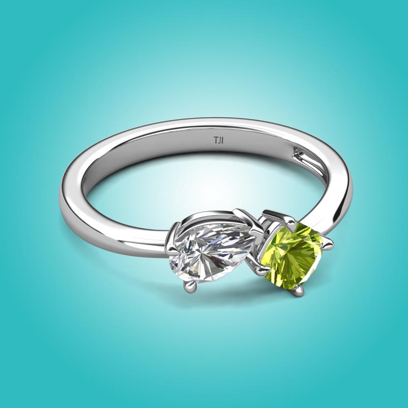The IGI Certified Lab Grown Diamond Pear Shape and Peridot Cushion Shape Two Stone Engagement Ring of 1.40 ctw set in a Prong setting, is a stunning piece of jewelry that features a unique "Toi et Moi" design, which means "You and Me" in French, symbolizing the union of two souls in love and giving a comfort fit to the wearer.