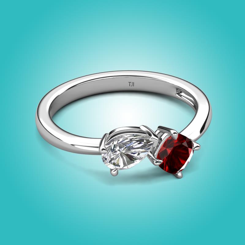 The IGI Certified Lab Grown Diamond Pear Shape and Red Garnet Cushion Shape Two Stone Engagement Ring of 1.50 ctw set in a Prong setting, is a stunning piece of jewelry that features a unique "Toi et Moi" design, which means "You and Me" in French, symbolizing the union of two souls in love and giving a comfort fit to the wearer.