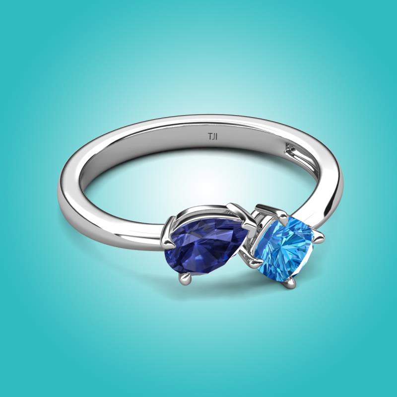 The Iolite Pear Shape and Blue Topaz Cushion Shape Two Stone Engagement Ring of 1.35 ctw set in a Prong setting, is a stunning piece of jewelry that features a unique "Toi et Moi" design, which means "You and Me" in French, symbolizing the union of two souls in love and giving a comfort fit to the wearer.