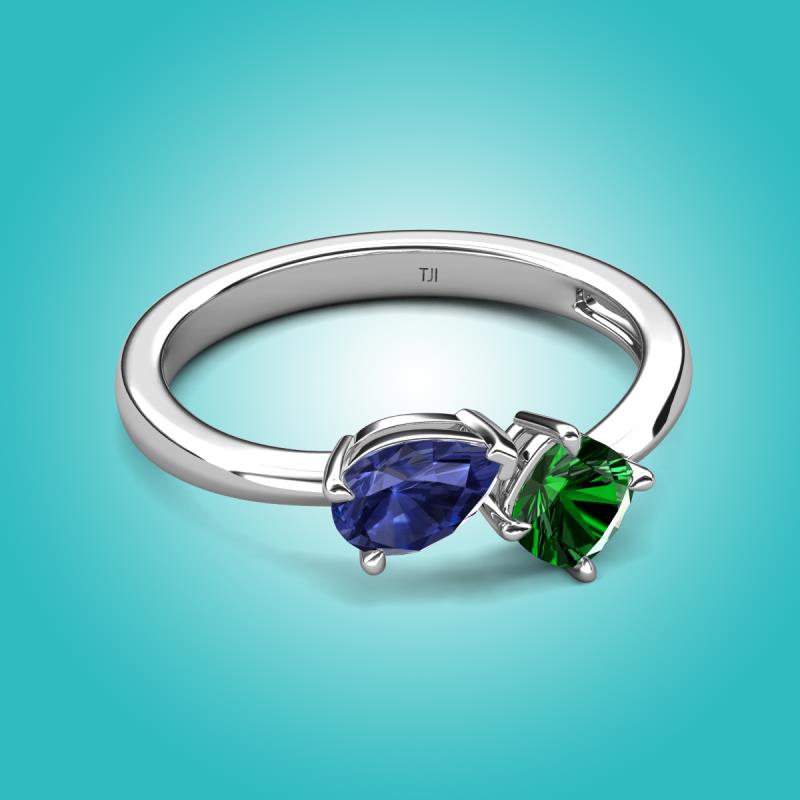 The Iolite Pear Shape and Lab Created Emerald Cushion Shape Two Stone Engagement Ring of 1.15 ctw set in a Prong setting, is a stunning piece of jewelry that features a unique "Toi et Moi" design, which means "You and Me" in French, symbolizing the union of two souls in love and giving a comfort fit to the wearer.