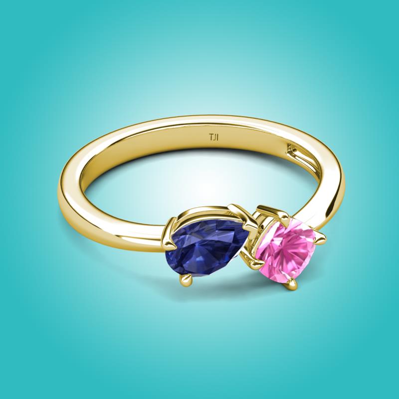 1.41 ctw Iolite Pear Shape 7x5 mm & Lab Created Pink Sapphire Cushion Shape 5.00 mm with Prong setting Two Stone Duo Women Engagement Ring in 14K Yellow Gold More Details ...